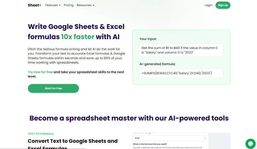 💡 Sheetplus.ai: si utilizas Google Sheet o Excel, esta herramienta es imprescindible. Te permitirá escribir fórmulas 10 veces más rápido utilizando IA. Solo tendrás que escribir en lenguaje simple lo que quieres que haga la fórmula, y Sheet+ te dará la fórmula lista para copiar y pegar. La versión gratuita te permitirá utilizar 10 fórmulas al mes.