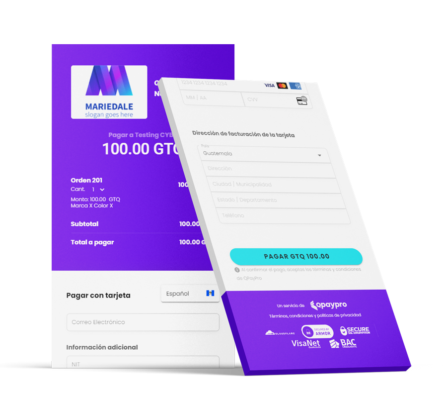 Todo ello, para que los clientes finales cuenten con una plataforma innovadora en la sección de links de pago, esto se puede visualizar en el computador con el baucher de cobro, la información y los datos de facturación. Otro aspecto a destacar es que cuenta con sello de nuestros avales Visa Net Guatemala y CiberSource que funcionan como sistema de seguridad encriptado lo cual garantiza mayor seguridad en las operaciones.